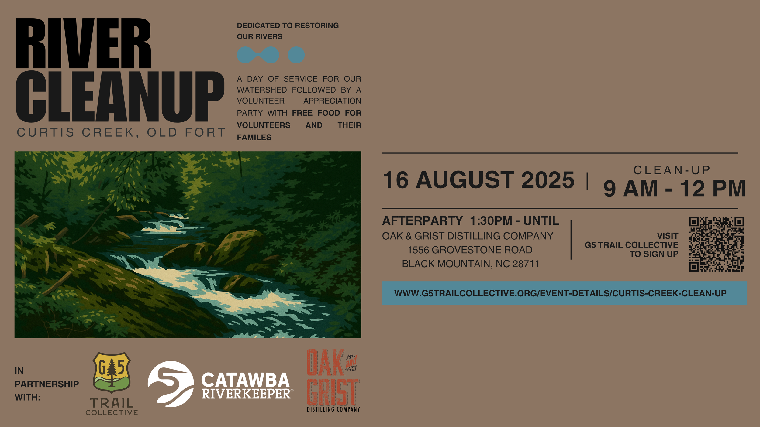 Want to help clean up our rivers and then? We’ve teamed up with Catawba Riverkeeper and G5 Trail Collective to put together a day of service, resilience, and celebration. Those who choose to join us will spend a few hours cleaning up our shared watershed; afterwards volunteers and their families are invited back to Oak & Grist Distilling for complimentary food for the whole family. In addition the distillery will be donating 5% of seasonal cocktail, beer, and wine sales for the day to our partner non-profits.