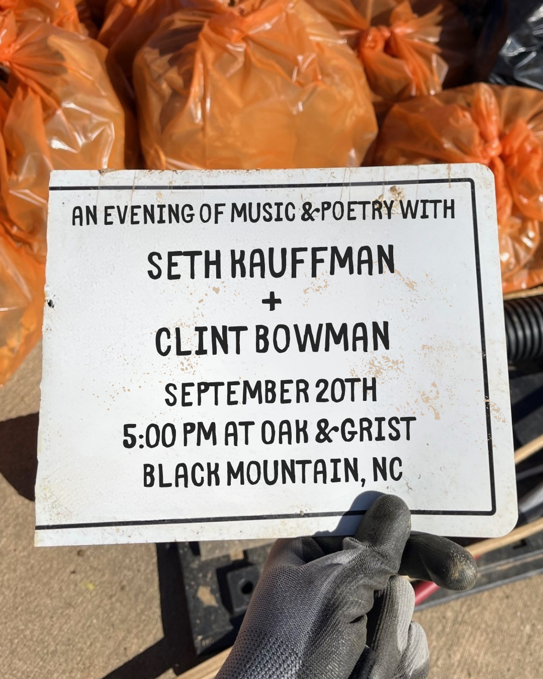 Evening of Music & Poetry: Seth Kauffman & Clint Bowman Saturday, September 20, 2025 5:00 PM 7:00 PM 17:00 19:00 Oak & Grist Distilling Company 1556 Grovestone Road Black Mountain, NC, 28711 United States (map) Google Calendar ICS Join us after our river clean up for an evening of music and poetry with Seth Kauffman (of Floating Action) & Clint Bowman (Dark City Poets Society) This event is free and open to the public.