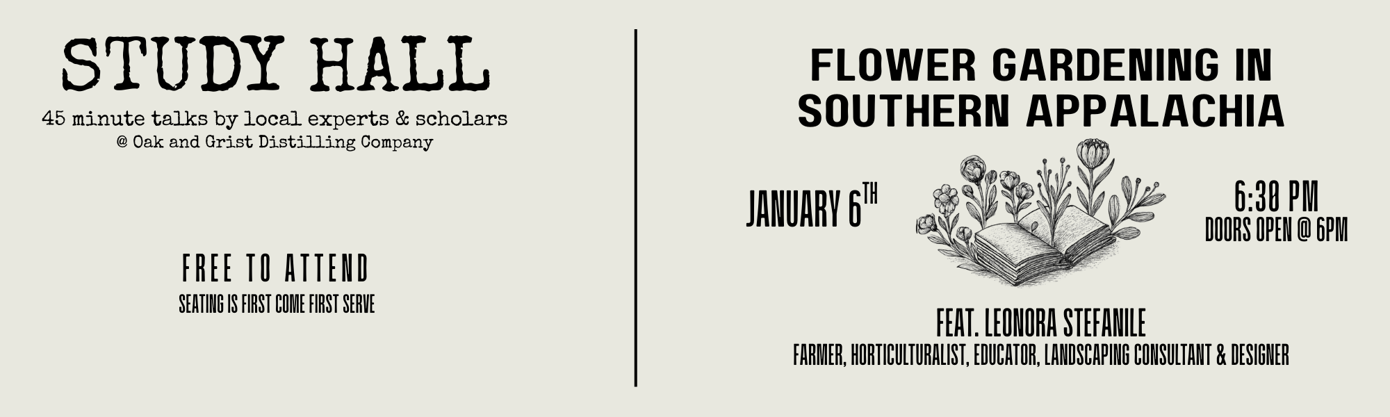 Study Hall at Oak & Grist Distilling is your chance to listen and learn from local experts and scholars. We are bringing specialists from a wide variety of fields to the distillery to speak on what they know best. Grab a drink, sit back, and become a little bit smarter.